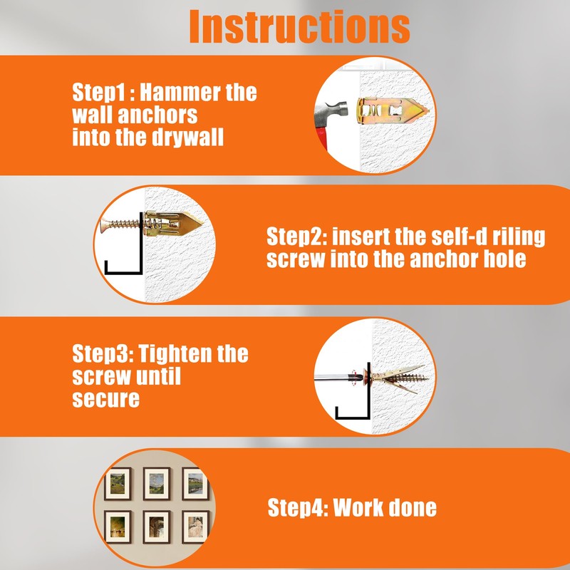 - 【Wide Application】This dry wall anchors and screws kit is suitable for 3/8", 1/2" or 5/8" gypsum wallboards, Sheetrock and other hollow walls. It is ideal for hanging picture frames, wall sconces, curtains, clocks, plants, cabinets and other items in home, office and other places.