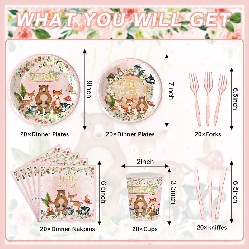 120 piezas de suministros para fiesta de bosques para niñas, baby shower, decoración de animales salvajes rosados, platos, servilletas, tenedores, cuchillos, vajilla desechable para 20 invitados