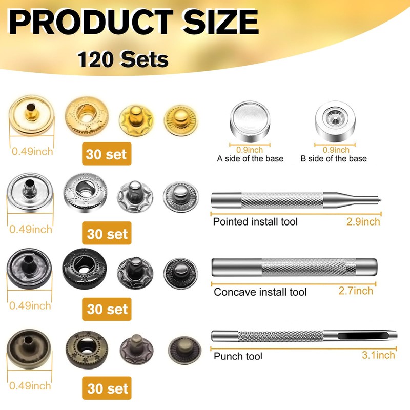 - Leather Snap Fasteners Kit: 120 SETS, 6 COLORS: Gold, Silver, Bronze, Gunmetal, Matte black and Jet black. 120 sets in total, 20 sets snap fasteners each color. Each set are made of cap, socket, close post ,stud and hammer.