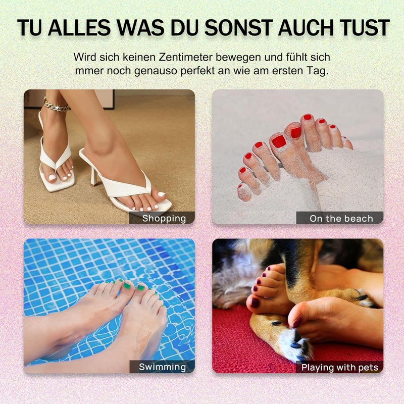 Träumen Sie von perfekten, professionell aussehenden Zehennägeln, die sowohl stilvoll als auch pflegeleicht sind? Unser Falsches Fußnägel Set bietet Ihnen genau das – eine schnelle, einfache und schmerzfreie Möglichkeit, Ihre Füße zu verschönern, wann immer Sie möchten! Mit diesem Set können Sie im Handumdrehen die perfekte Nagelkunst für Füße kreieren, die genauso gut aussieht wie im Salon – jedoch zu einem Bruchteil des Preises!