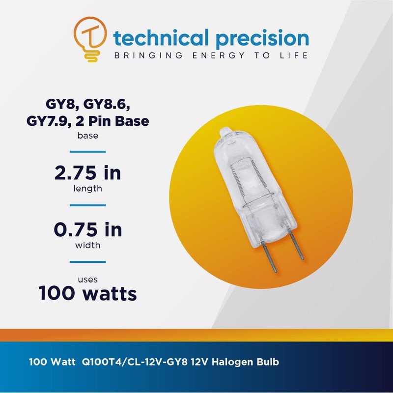 - BULB SPECIFICATION - Halogen bulb 120v 100w with a GY8, GY8.6, GY7.9, 2 Pin Base. Clear finish, and T4 bulb shape. Q100T4/CL-12V-GY8