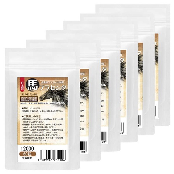 馬プラセンタ12000 60粒 6袋セット計360粒 1日目安/4粒 90日分 北海道サラブレット胎盤使用 1袋当たり馬生胎盤 約12,000mg相当配合