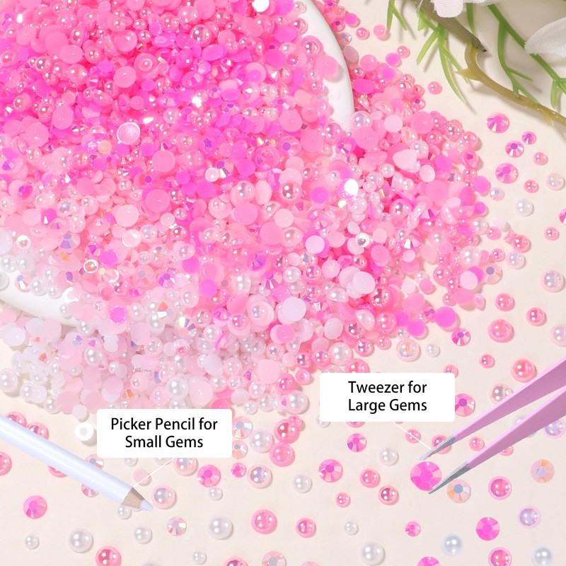 - Package Content: You will receive a box of pink white half pearls nail charms and pink flatback jelly rhinestones. This bedazzling kit also includes 1 picking pen and 1 tweezers for easy bead picking