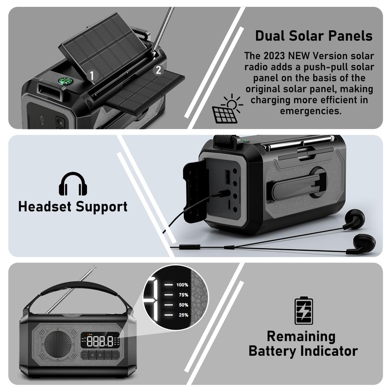 - 【12000mAh Ultra-Kapazität & Zwei Solarpanels】Verabschieden Sie sich von den Einschränkungen gewöhnlicher Notfunkgeräte. Revolutionieren Sie Ihre Notfallvorbereitung mit unserem 12.000mAh Solarradio! Mit der größten Batteriekapazität auf dem Markt, bleiben Sie in kritischen Zeiten mit Ihren Geräten verbunden. Unser Handkurbelradio verfügt über zwei Solarmodule für unübertroffene Effizienz und gewährleistet eine zuverlässige Aufladung, wo immer Sie sich befinden.