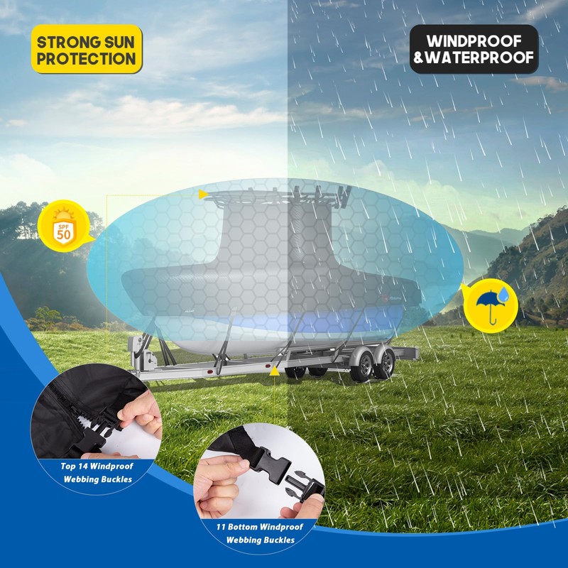 - ๐๐-๐๐๐ฌ๐ข๐ฌ๐ญ๐๐ง๐ญ ๐๐ก๐ข๐๐ฅ๐: The Hard Top boat coverโs 1200D Oxford fabric includes a UV-reflective coating, blocking 99% of UV rays to prevent fading or weather damage.