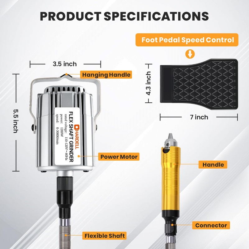 - 【1200W Super Strong Pure Copper Motor】 HARDELL flexible shaft grinder is equipped with a 1200W heavy-duty pure copper motor, which is super powerful and can reach a maximum speed of 30,000 RPM. It uses advanced noise reduction and vibration reduction technology to ensure long-term smooth operation. The upgraded cooling system prevents overheating, prevents motor burnout, and extends service life, bringing you better efficiency improvement and use experience.
