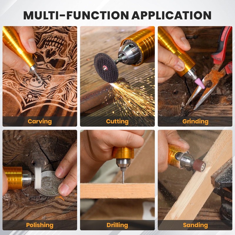 - 【Over 40 Versatile High-Quality Accessories】 A full range of accessories designed for flexible shaft rotary tools, including grinding wheels, cutting discs, polishing wheels, drill bits (1mm, 2.3mm, 3.2mm), engraving heads, wire brushes, mandrels, and more. Each accessory is carefully designed and durable, allowing you to easily use the flexible shaft grinder for metal cutting, wood drilling, deburring, resin jewelry jade processing, and grinding and polishing of various materials.