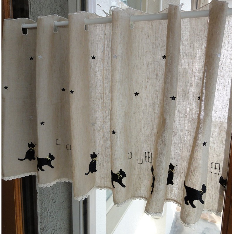 黒猫柄 麻混ナチュラルベージュ カフェカーテン(幅120cm x 丈45cm)