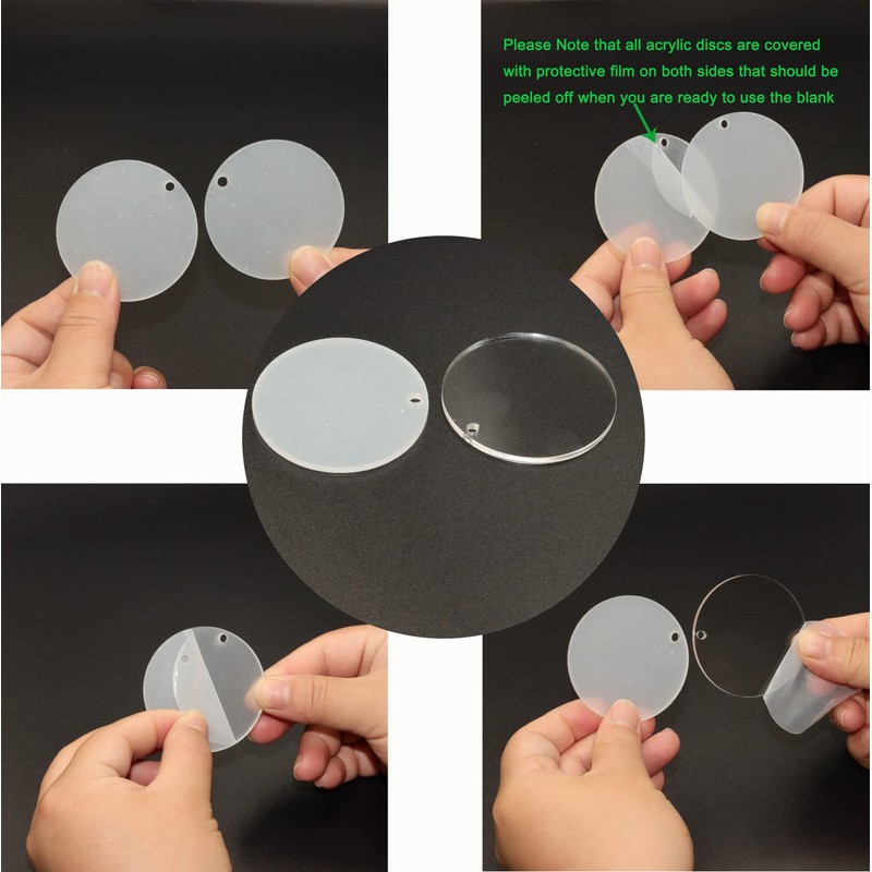 - Please Note that all acrylic discs are covered with protective film on both sides that should be peeled off when you are ready to use the blank. This protective layer keeps the acrylic blank from being scratched or getting dirty.