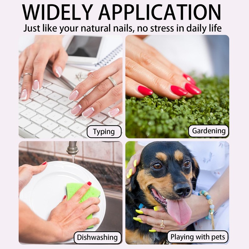 4.Try to avoid soaking your hands for a long time when you are wearing them.Water will loose your glue then nails will drop!