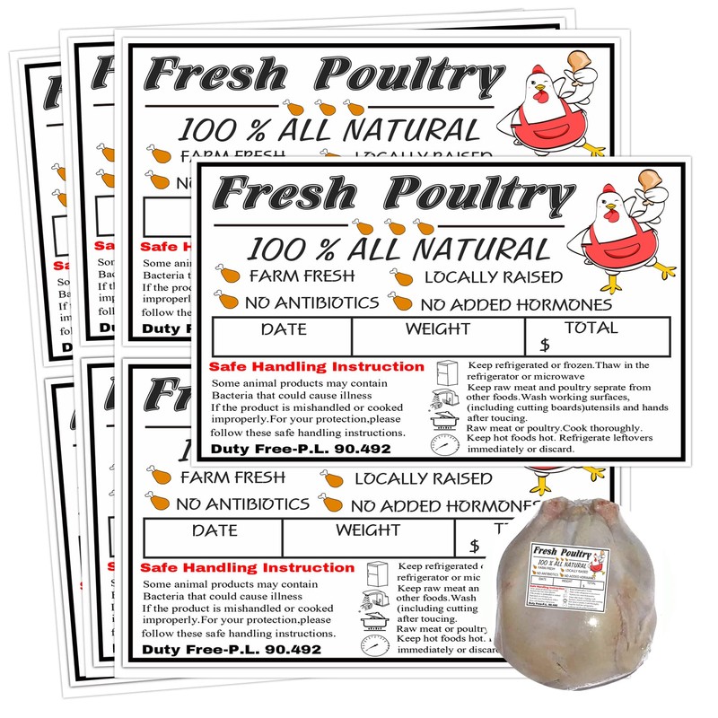 For best results when using stickers, please tilt all surfaces and keep them dry before applying our poultry labels. These labels can be stored in the refrigerator with all the necessary safe handling information and include the federal small The poultry producer is exempted for reference.