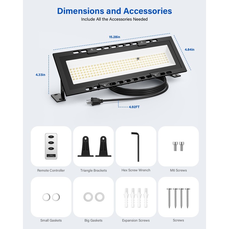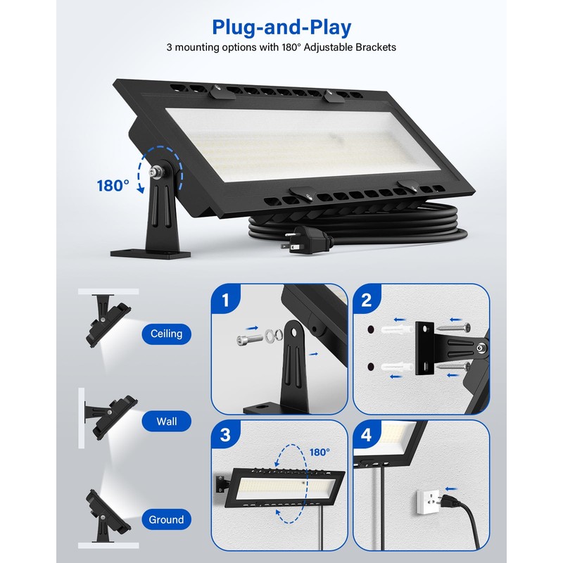 - Easy & Reliable Installation: The work bench light comes with 2 x triangle brackets, a plug-and-play and extra-long 4.92ft power cord, 4 x gaskets, a hex screw wrench and all the screws needed. Anyone can install it on ceilings, walls, ground and other possible surfaces easily in seconds, no need to pay for professional electricians. And we reinforced all four corners with screws besides glue adhesion on the len to avoid sudden drops from high which may cause fatal hurt to led light and humans.