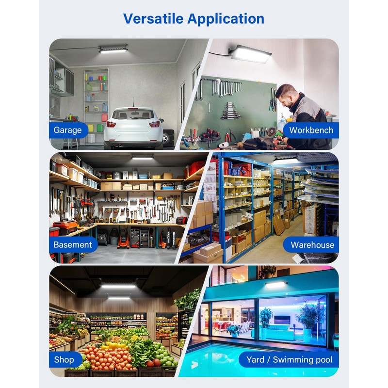 - Versatile Application Occasions: This light is perfect choice for a wide range of occasions including garages, workshops, workbenches, basements, storage rooms, equipment rooms, tool rooms, utility rooms, laundry rooms, parking lots, porches, yards, gardens etc. Features IPX66 waterproof grade, it is also suitable for outdoor application even on rainy days. (Keep noticed that you have to prepare a waterproof socket yourself)