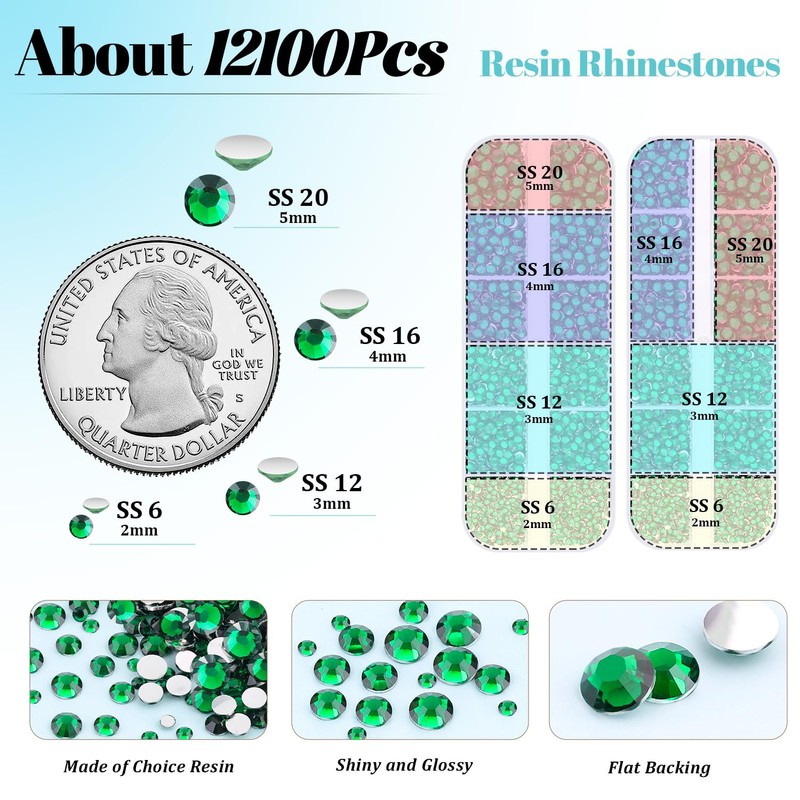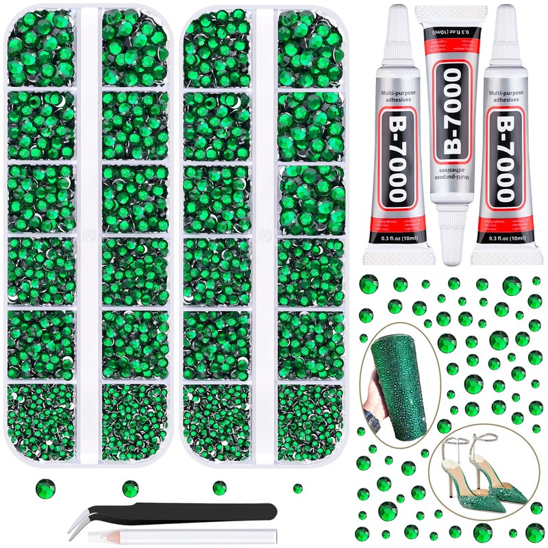 12100Pcs Resin Rhinestones for Crafting with 3Pcs 10ml B7000 Jewelry Glue, 2 Boxes Flatback Crystals Diomand (Emerald Green) for Bedazzling Crafts DIY Nail Art,Non Hotfix Gems for Clothing Shoes