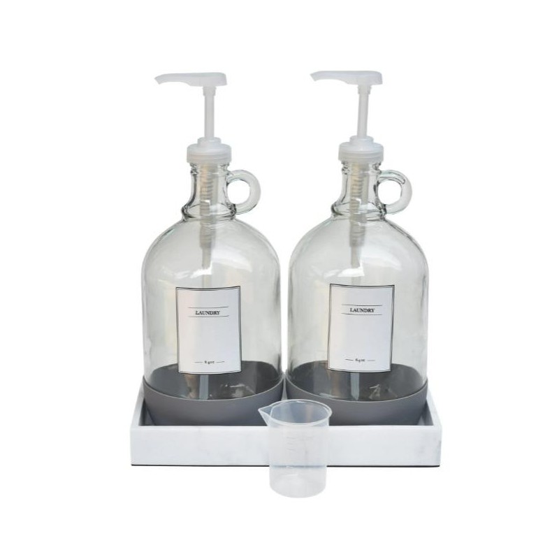 This Glass & Resin Laundry Detergent Dispenser Set is a great addition to any bathroom supplies collection. The set includes 4 pieces, each with a capacity of 128 fluid oz, making it perfect for bulk-sized detergents. The clear and white design is both eco-friendly and durable, making it a reusable option that promotes cost-effectiveness and helps reduce plastic packaging. Key Features: - 4-piece set with each dispenser holding up to 128 fluid oz - Made of eco-friendly glass & resin material - Reusable design promotes cost-effectiveness while reducing plastic packaging The clear glass allows you to easily monitor the detergent level so you know when it's time for a refill. The dispensers feature easy-to-use pumps that make dispensing detergent quick and mess-free. This Laundry Detergent Dispenser Set is designed with practicality in mind while also adding style to your bathroom space. Upgrade your home supplies collection today!