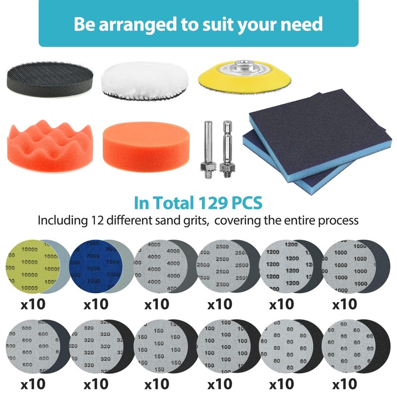 - 129 pieces with 12 grits: (60/80/100/150/320/600/1000/1200/2500/4000/7000/10000, 10 each). Includes 1/4" shank backer plate, round/hex shanks, buffering pad, genuine wool pad, orange sponges & 120/240 grit sponge blocks* – no additional purchases needed.