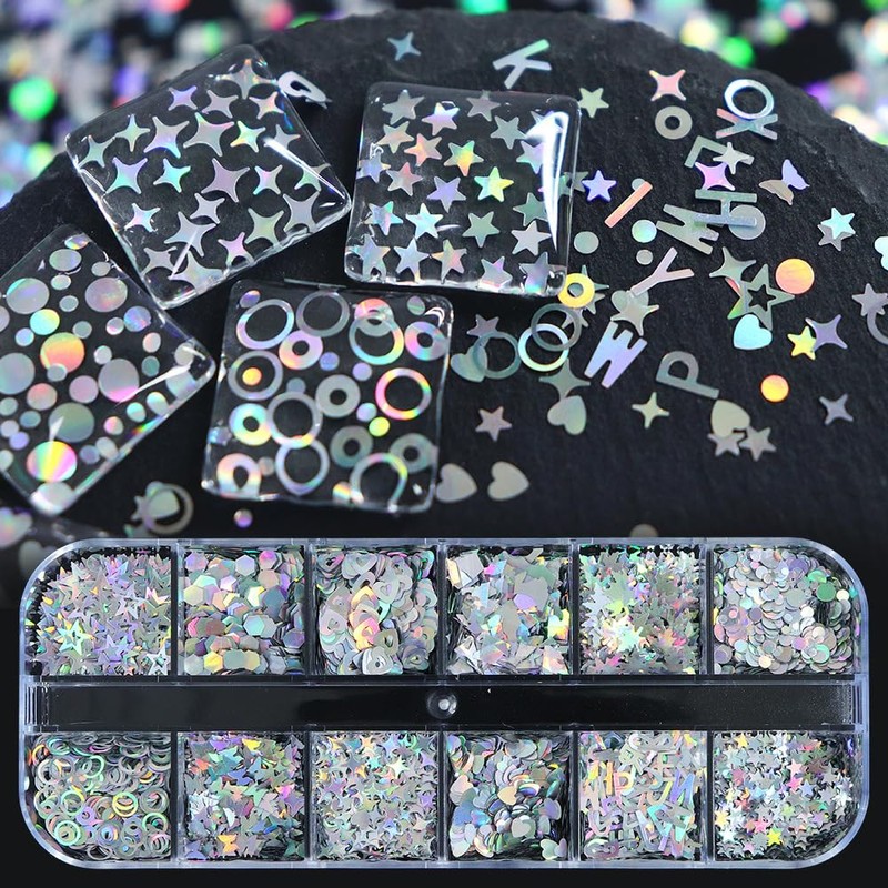 • VARIOUS Shape: Package includes 12grids holographic nail art decor powder ,circle/butterfly/ leaf/round and star sequins / nail glitters. Fashionable and beautiful colors.
