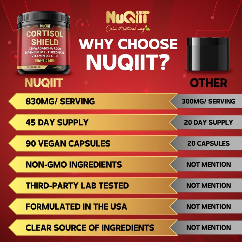 - Experience the Finest Quality Ingredients: NUQIIT high-quality extracted Cortisol Manager comes from Extract 12:1 ingredients Ashwagandha Root, Magnesium L-threonate, Vitamin D3, Vitamin C, Vitamin B6, Lions Mane, Rhodiola Rosea Root, Licorice Root, Magnolia Bark, St. John's Wort, Phosphatidylserine, Black Pepper; providing better absorption.