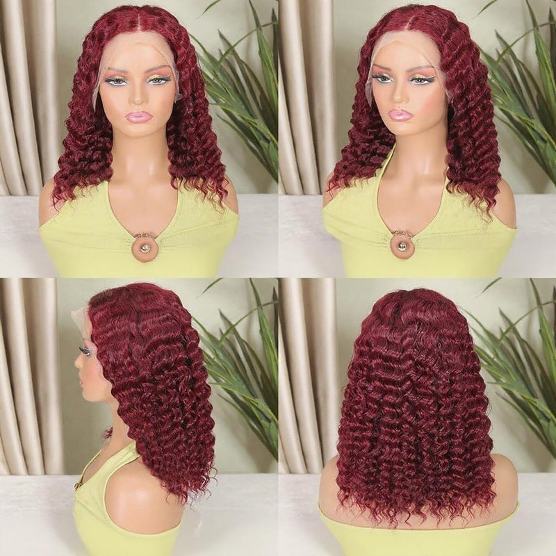 12INCH 99J Burgundy Water Wave Lace Front Wigs Human Hair Deep Curly Short Bob Wig Human Hair Pre Plucked 200% Density Lace Frontal Wigs for Black Women 13x4 Hd Deep Wave Glueless Wig