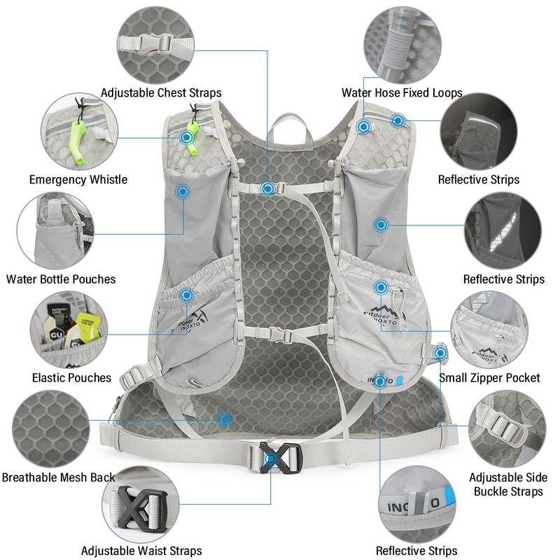 1、Main compartment accommodates a 1.5L water bladder (not included), convenient hydration system keep you replenished. 2、Multiple front pockets help classify your belongings and keep them neat and organized. 3、Reflective strips for increased visibility and safety during nighttime activities.
