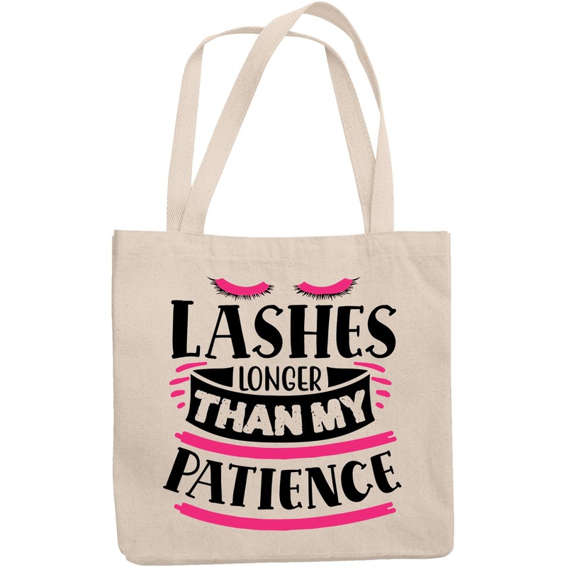 12oz Canvas Tote Bag - Lashes Longer Than My Patience, Impatience & Eyelashes Humor Quote - Beauty Themed Merch for Makeup Artist or Cosmetologist, Gift for Makeup Lovers & Beauticians