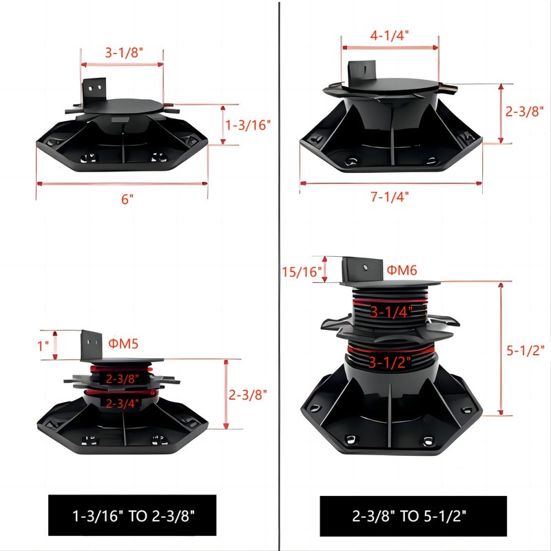 - 【Adjustable Height】: Our deck support pedestal has 2 height adjustment holes, allowing you to easily adjust the height from 1-3/16" to 2-3/8". This feature is very practical for different needs, such as leveling uneven ground, raising a deck to a desired height, or creating a storage space under the deck.