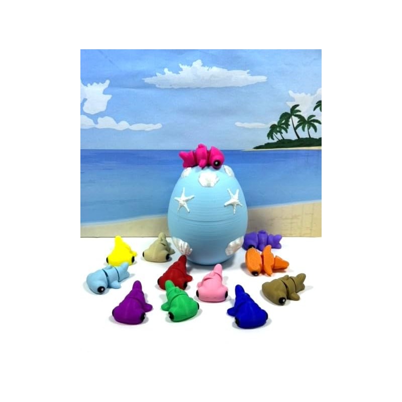 Introducing our 3D Printed ARTICULATED Baby Hammerhead Sharks with Pink Shelled Egg. Each item measures 1.75" long, very cute and articulated. These 12 pcs posable Baby Hammerhead Sharks are meticulously crafted with an eye for detail, this interactive desk accessory is not just a source of entertainment, it's also a stress-relieving toy and a chic decor piece for any space. ------- Small Components Advisory: ------- Please be mindful that this product may contain small components and may not be suitable for very young children. Due to the nature of 3D printing, there is a potential for small components to detach if handled aggressively or dropped. Please be aware that 3D printed objects may exhibit minor imperfections like layer lines, inherent to the printing process. While we strive for the highest quality, these imperfections contribute to the distinctive character of each piece, making each Sharks uniquely crafted for you. The available color options are illustrated in the provided photos. Keep in mind that variations in color may arise from discrepancies in filament production and the characteristics of your monitor or screen. Additionally, the use of multi-colored filament rolls can influence color distribution in the prints. ------- Licensing Information: ------- Authorized Design: NOHo3D holds the official authorization for the production of this exquisite design created by Zou3d designs.