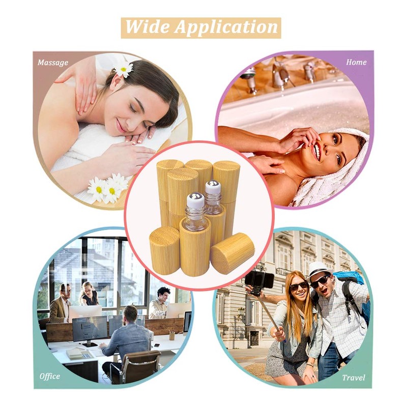 **Bamboo Essential Oil Roller Bottles are the most convenient and economical way to dispense essential oil blends.** **Compact Size** : diameter:0.78 inch/20cm; height:2.2inch/75cm. **Capacity** :5ml,0.17 fl oz. **High-quality bamboo shell Roll on Bottles** Natural Bamboo Wooden appearance make you classical & eco-friendly. Roll balls are made of premium Stainless steel, smooth and anti-shock. Clear inner bottle is corrosion resistant. Delicate workmanship and light weight. Protects essential oil from quick volatilization. **No More Messy Drips or Spills** A refillable roller bottle will allow you to pre-dilute your oil blends so that they can be applied directly to the skin. Just the right amount of oil is applied every time, with no leaking. Roller bottles are the most convenient and economical way to dispense essential oil blends. **Convenient & Practical for Your Daily Personal Care** With essential oil bottle opener can easily be disassembled and Refillable. Allow you store Synthesis Oil, Natural essential oil, essence, perfume or other liquids, meet your needs of daily care for eyes, faces and body. **Portable Travel/ Office/Massage Belongings** Due to vial size, small enough to fit your pocket or purse. Make it convenient to carry while traveling and working. With our oil glass bottles, you can relax yourself and enjoy every moment during massage or beauty salons. **Package Content** 12Pcs x 5ml Clear Glass Bottles with bamboo shell 12Pcs x Stainless Steel Roller Ball 1PC x Bottle Opener **Share our Bamboo roller bottle with your family or friends, bring you unique sense of beauty and a good mood when you use it.**