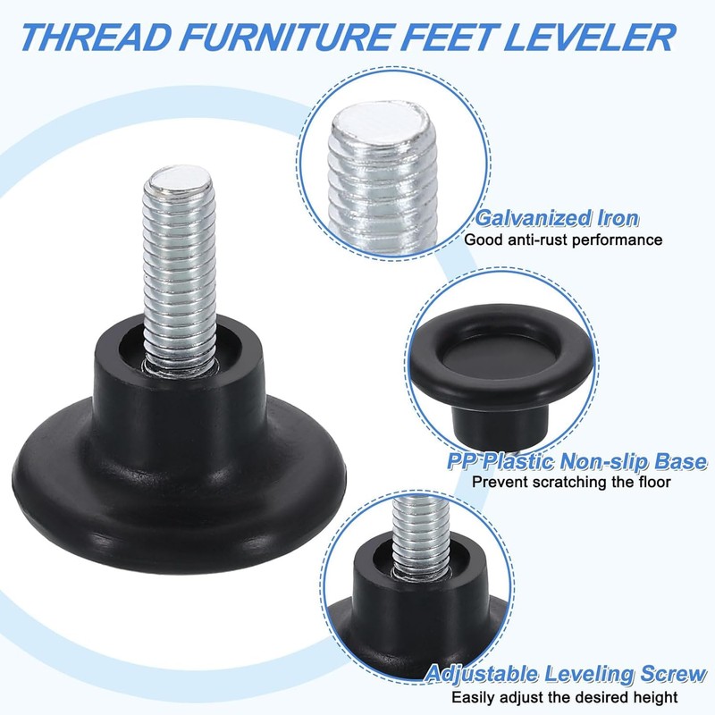The base of screw-in leveling feet is made of PP material, wear-resisting, non-skid, sturdy, and durable. It protects your table, sofa, cabinet from scratching, keeps your furniture balanced, and provides good shock absorption.