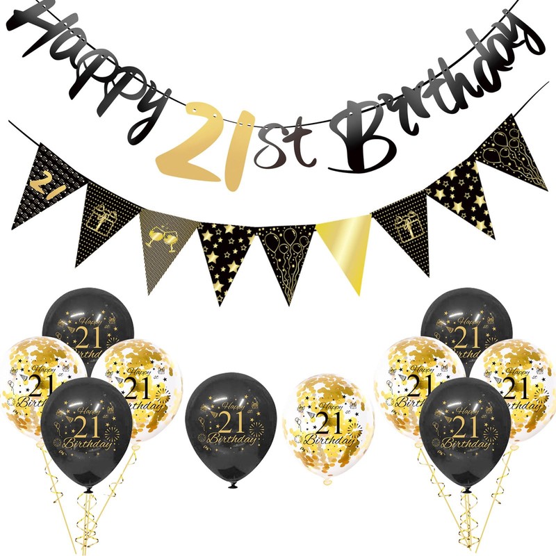 - 🎈100% Paper Birthday Decor:Black gold 21st birthday party supplies set including 1* about 2.5Meters Happy 21st Birthday Banner, 1* birthay triangular bunting, 5* white gold latex balloons and 5* Black gold balloons,Sufficient quantity and different styles that perfect for your 21st birthday party.