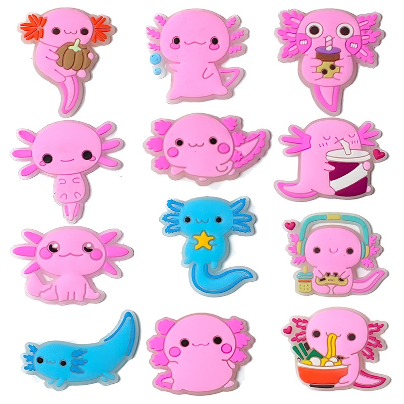 - LUMINOUS DESIGN: Add a splash of cuteness to your shoes with 12 unique charms inspired by the adorable axolotl. Each charm features a different pose or activity – from sipping bubble tea to enjoying ramen!