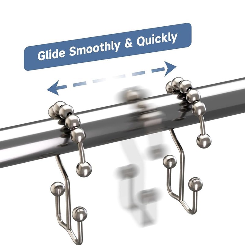 - Double hooks design: The double roller glide shower hooks are strong enough to hold up shower curtain and shower liner.