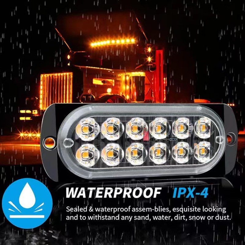 Strobe lights with 12 LEDs, 4 with 24 LEDs—bright day/night, visible hundreds of feet. Aluminum/ABS build, IP67/IP68 waterproof, 50k+ hr lifespan. 12–22 flash modes, sync/async, memory recall. Ultra-thin, easy install (gaskets/screws/11.5ft wires). Fits 12V–24V cars/trucks/ATV/UTV/emergency vehicles.