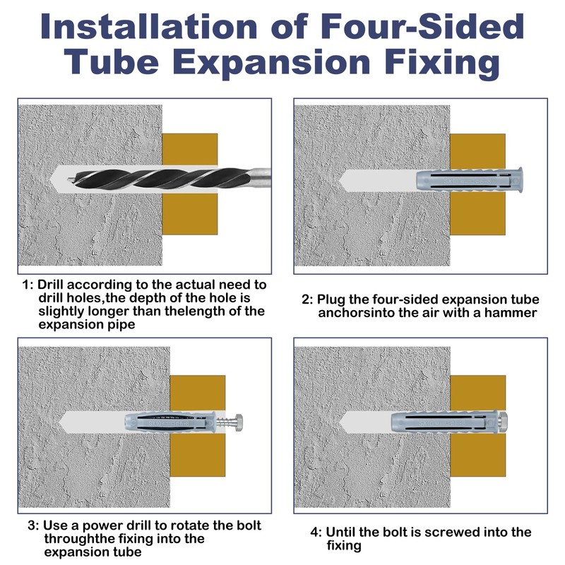- 【Easy to Install】 Mark the place where it needs to be installed and fixed. Use a drill bit to drill a hole slightly longer than the expansion anchor and hammer it in place. Drive the expansion anchor into the hole and screw the bolt into the anchor bolt. Tighten and fix
