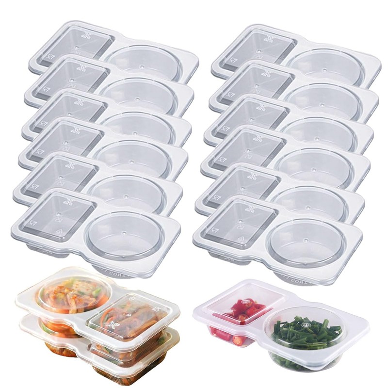 - 3. The double compartment condiment container can easily store or hold side dishes, sauces, etc. There are 12 sets in the package, each set includes a container and a lid. This set of containers provides great convenience for restaurant or food truck takeout orders