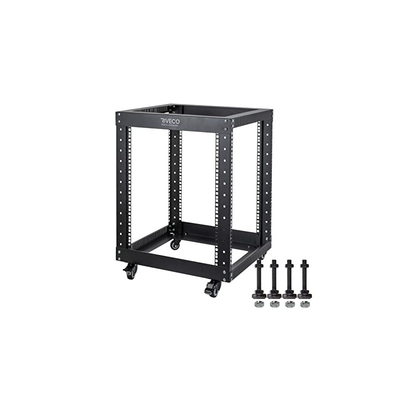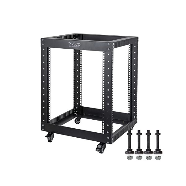 12U Server Rack Open Frame with Casters-RIVECO 4 Post Quick Assembly 19-inch, Data Rack Network Shelf Cabinet Heavy Duty Black