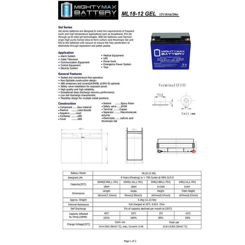 - ML18-12GEL is a 12V 18AH GEL rechargeable maintenance free battery. Pack of 2