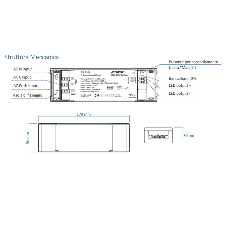 12V 75W Dimmable Power Supply with N.O. Push Dimmer and Remote RF 2.4G for LED Strip 12V Skydance PB-75-12