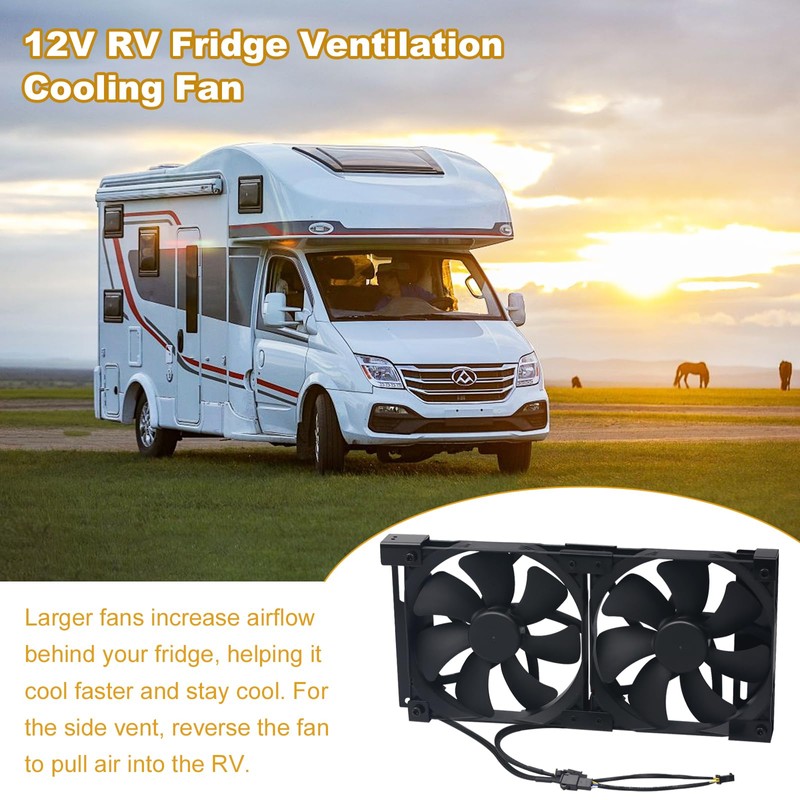 - Product function: The 12v rv refrigerator fan For RV refrigerator ventilation and grille ventilation. The vent fan features two large 5.5" fans powered by your 12V connection to maximize airflow behind your fridge to increase fridge efficiency and cooling.