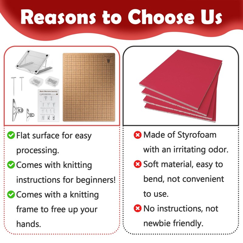 - Package Includes: Macrame board kit includes a 12×16 Inch macrame board, a stand, 1 box of 38 mm T-pins, 1 box of 51 mm T-pins, 1 pcs 7cm clip, 1 pcs 15cm clip and an instruction booklet, perfect for knitting beginners and experienced crafters