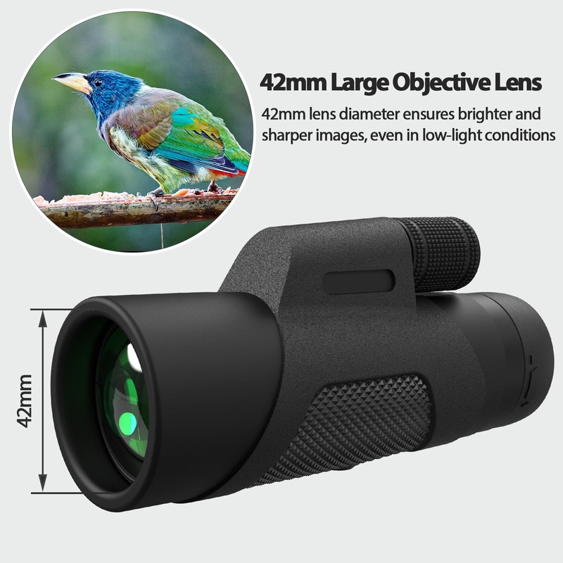 - 12x42 High-Powered Monocular: Experience crystal-clear detail 12x magnification and a 42mm wide lens—ideal for tracking fast-moving wildlife or zooming into concert stages. This high power monocular delivers bright, sharp visuals even at dusk, making it a must-have for hunters, birders, and sports fans