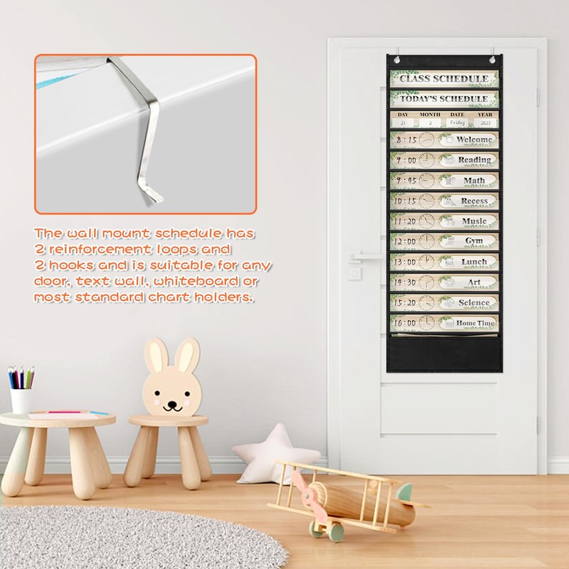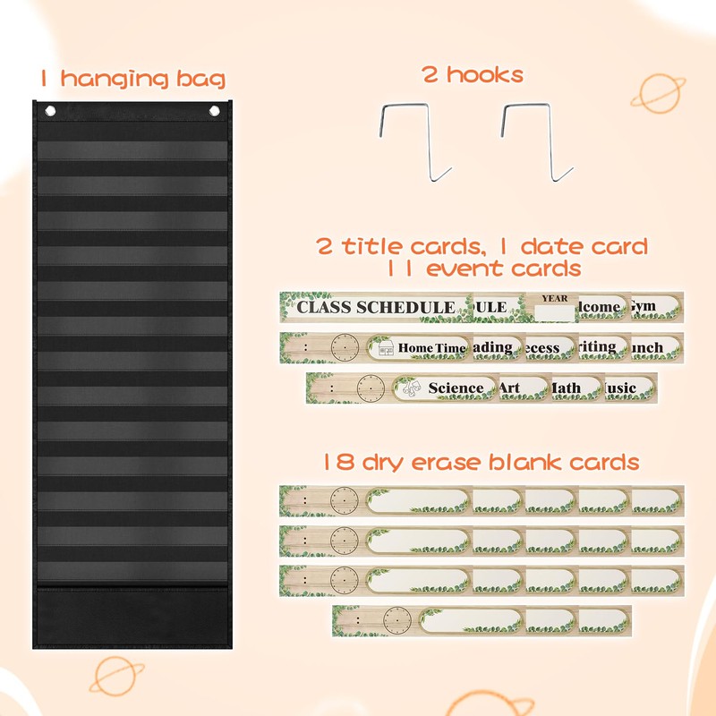 - You Will Get : Including1 pcs of the daily schedule pocket chart with 13+1 pockets, 2 pieces easy over-door mounting hangers, 22 reusable erasable cards. 1 bottom tool pocket for cards not in use and stationery like markers, scissor etc.
