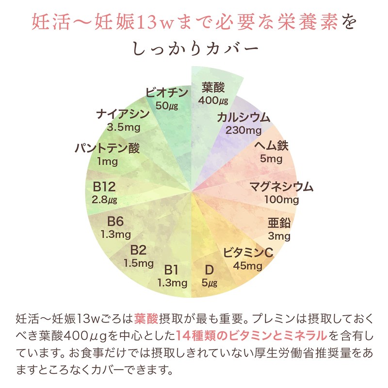 普段のお食事だけでは摂取しきれていない妊活から妊娠13週あたりまでの女性に重要な栄養素を摂取出来ます。