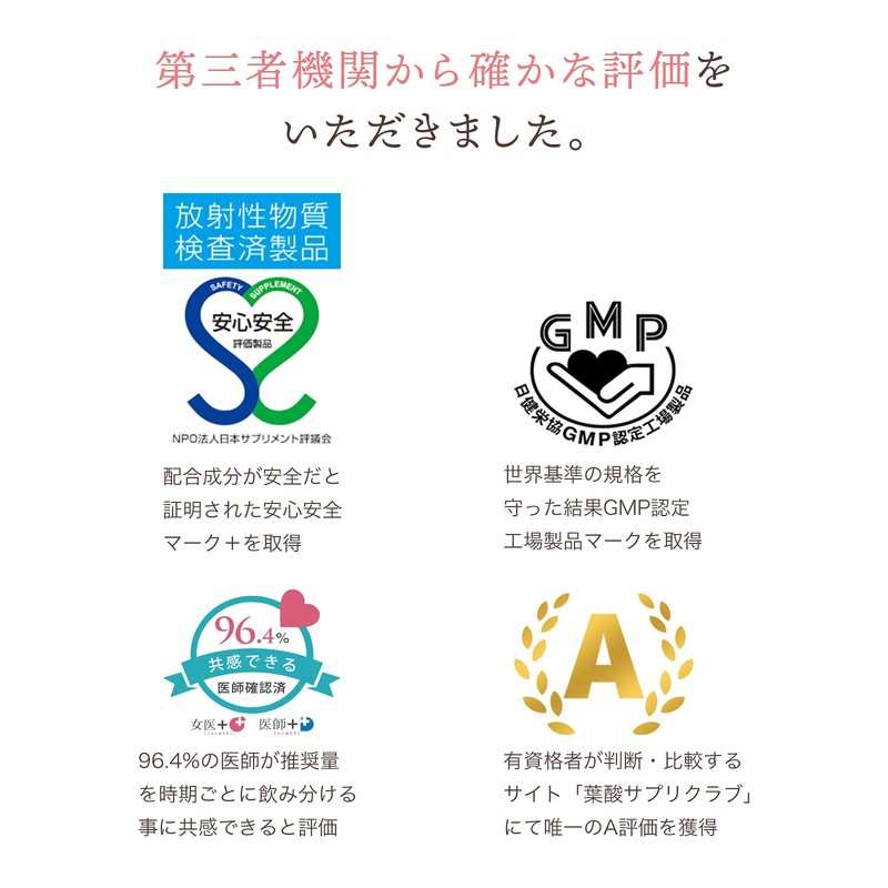 - 【臨床試験実施済み妊活サプリメント】一般女性による安全性臨床試験を行い、安全性が実証されているので、安心して摂取していただける妊婦用葉酸サプリです。(UMIN登録済み)また、第三者機関より「安心安全マークプラス」、「GMP認定工場製品マーク」を取得済みです。