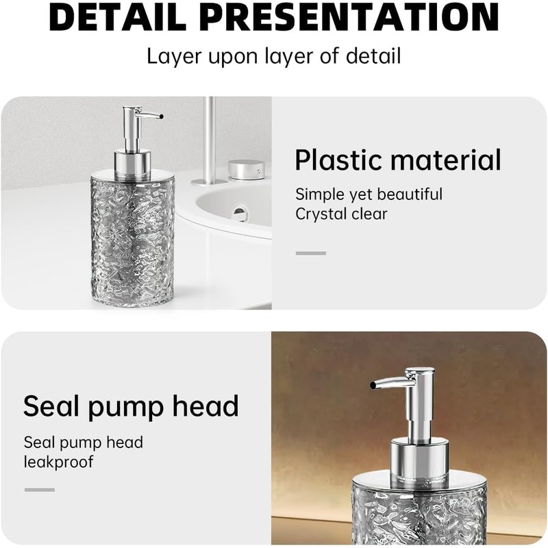 - Modern & Practical Design: Featuring a sleek water ripple pattern, this soap dispenser enhances any decor with a touch of sophistication. The translucent gray body lets you easily monitor the liquid level, so you will always know when it’s time for a refill