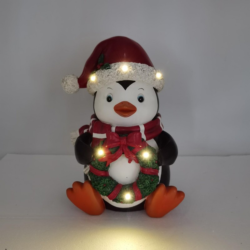 - Bring a touch of festive cheer to your holiday decor with this delightful Christmas penguin figurine. Standing at 13.5 inches tall, this charming decoration features a smiling penguin donning a Santa hat and holding a wreath adorned with twinkling LED lights.