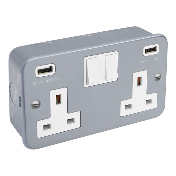 13 Amp Metal Clad Socket 2 Gang Switched Socket 250v with Dual USB Charger