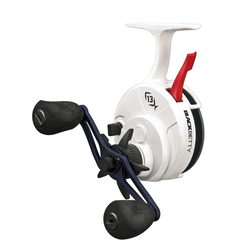 13 FISHING - Freefall Ghost Maverick - Inline Ice Fishing Reel - Red, White & Blue Color - Right Hand Retrieve - BBFFGWUSA-2.5-RH