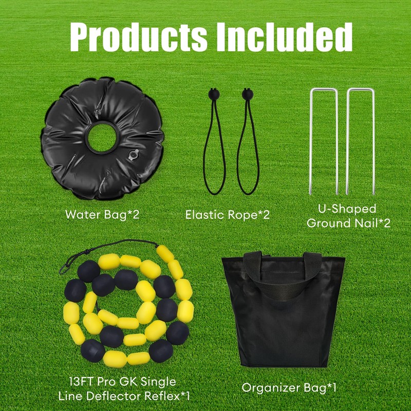 - Products Included: 13 FT Pro Goalkeeper Trainer Single Line Deflector Reflex*1, Water bag*2, U-shaped ground nail*2, Elastic rope*2, Organizer bag*1
