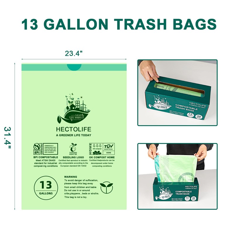 - Convenient Size and Packaging: These 13 gallon compostable trash bags(23.5inches x 31.4 inches). Each roll contains 50 bags,2 rolls. And with double layer drawstring for easy tying,easy Lifting